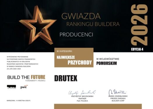 Czołowy polski producent stolarki otworowej o globalnym zasięgu otrzymał nagrodę „Gwiazda Rankingu Buildera 2026” w kategorii „Największe przychody w województwie pomorskim”. To kolejne wyróżnienie jakie zdobył Drutex w ramach projektu „Build the Future” realizowanego przez miesięcznik Builder i PwC Polska, doceniające dynamiczny rozwój firmy z Bytowa.