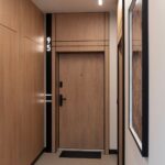 Wizualnie to jednak coś więcej. Każdy element został dogłębnie przemyślany. Skrzydła drzwiowe wykończone w ciepłym odcieniu drewna doskonale korespondują z przestrzenią. Zabudowy na indywidualne zamówienie z czarnymi intarsjami stanowią ciekawy wyróżnik, a całość w perfekcyjny sposób współgra ze stonowanymi barwami korytarza.