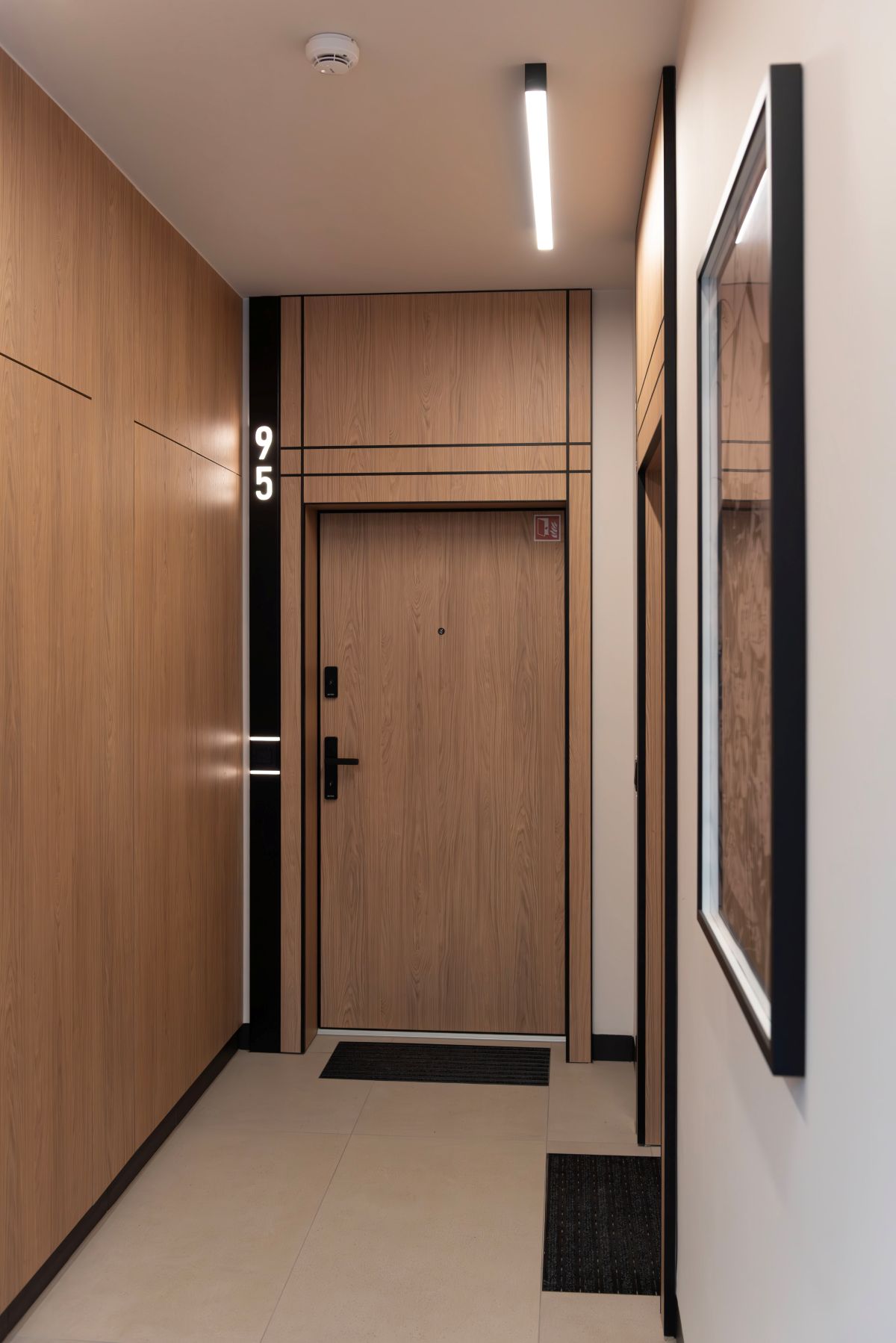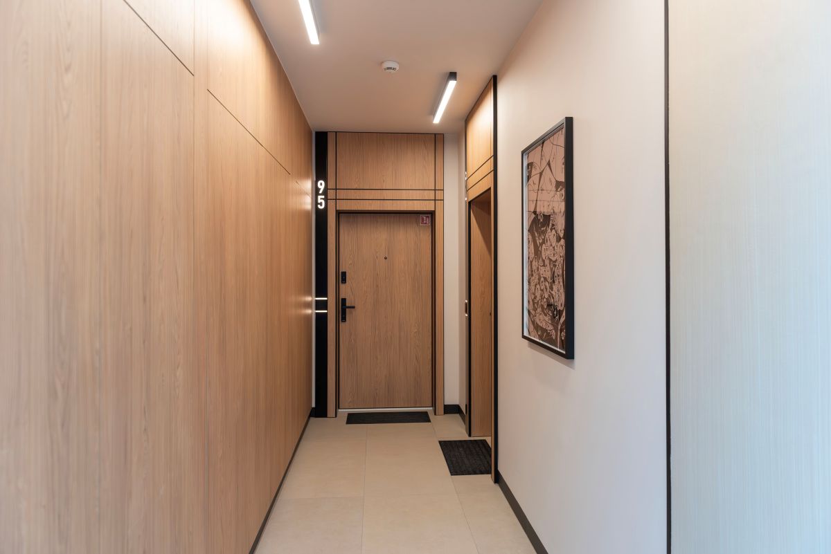 Wizualnie to jednak coś więcej. Każdy element został dogłębnie przemyślany. Skrzydła drzwiowe wykończone w ciepłym odcieniu drewna doskonale korespondują z przestrzenią. Zabudowy na indywidualne zamówienie z czarnymi intarsjami stanowią ciekawy wyróżnik, a całość w perfekcyjny sposób współgra ze stonowanymi barwami korytarza.