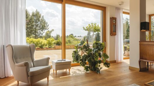 Uspokajający wpływ zieleni możemy uzyskać również dzięki stolarce pionowej FAKRO INNOVIEW. Wielkopowierzchniowe przeszklenia otwierają przestrzeń w domu na otoczenie i pozwalają w pełni cieszyć się widokiem natury. Drzwi tarasowe HST umożliwiają realizację tej idei w dużej skali, zapewniając przy tym komfortowe wyjście na zewnątrz dzięki niskiemu progowi o wysokości zaledwie 5 mm. Ta niemal niewidoczna linia łączy wnętrze z tarasem i zaprasza do delektowania się naturą, która wycisza i pozwala odpocząć.