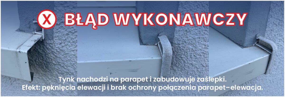 ● źle wykonane pomiary (np. spadek liczony od górnej krawędzi parapetu zamiast od dolnego zagięcia),