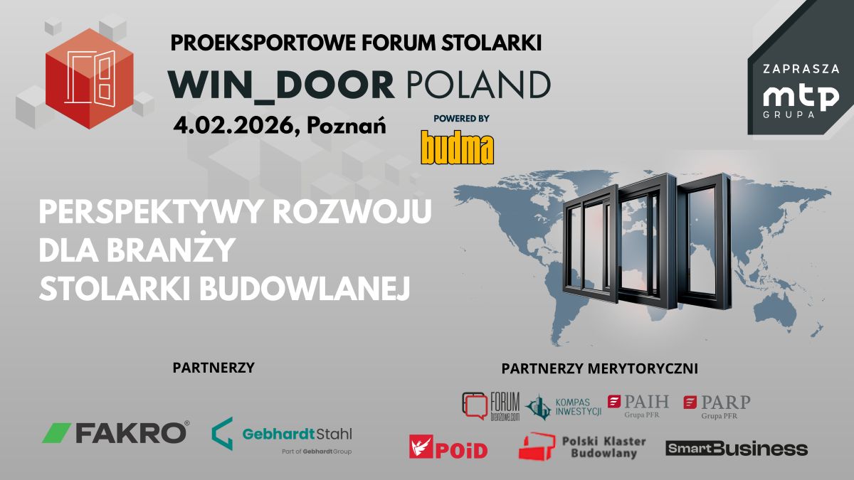 Proeksportowe Forum Stolarki WIN_DOOR POLAND odbędzie się 4 lutego we foyer pawilonu 10. To jedno z wydarzeń bogatego programu bloku targów BUDMA, które odbędą się w dniach 3-6 lutego 2026. Towarzyszyć im będą: Międzynarodowe Targi Maszyn Budowlanych, Pojazdów i Sprzętu Specjalistycznego INTERMASZ, Rozwiązania dla Budownictwa Infrastrukturalnego INFRATEC oraz Targi Branży Kamieniarskiej STONE.