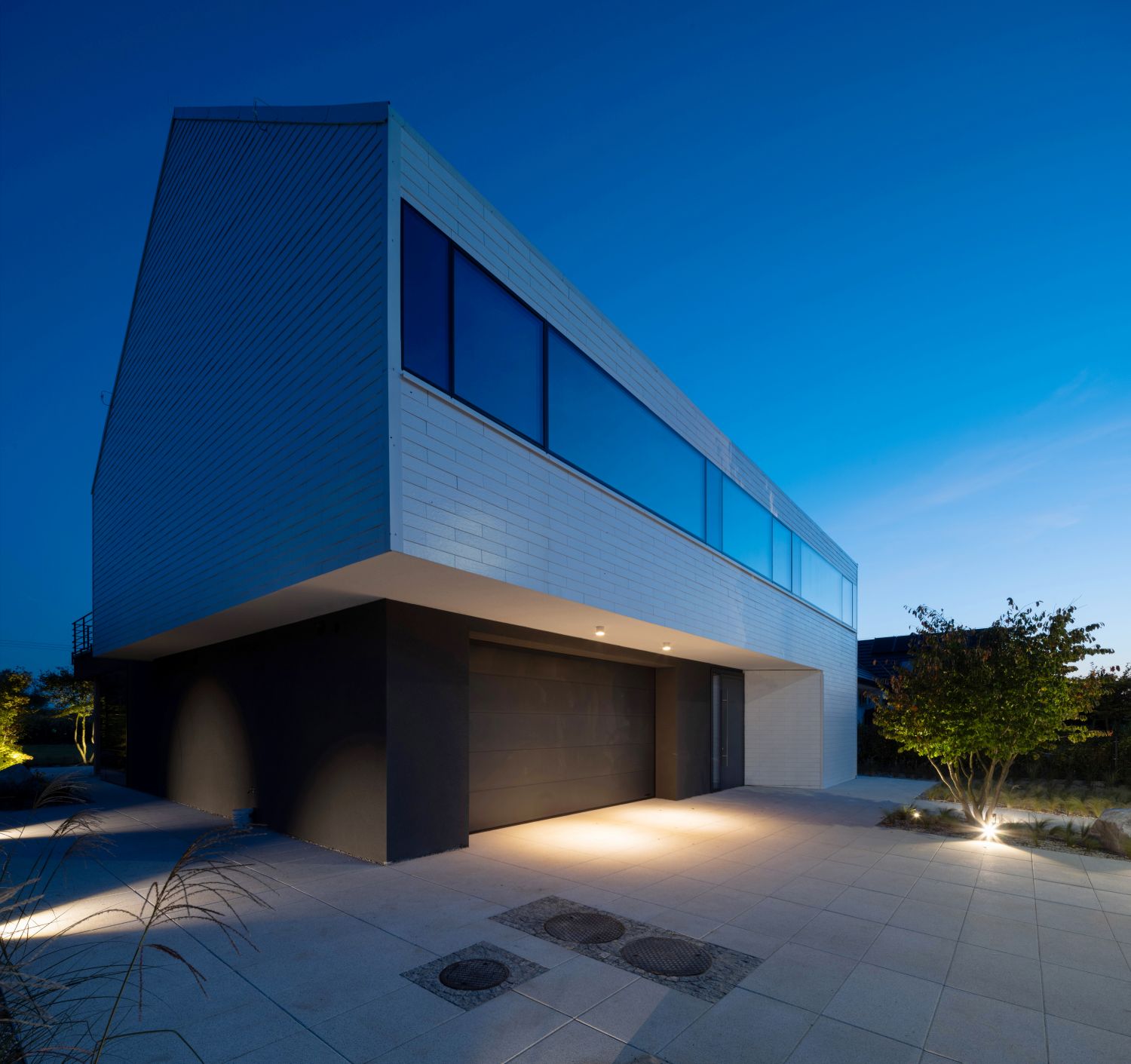 Architekci postawili na czystą, syntetyczną formę, w której dominują proste linie, kontrastujące materiały i spójna paleta barw. Dom składa się z dwóch przenikających się brył – masywnego, grafitowego parteru oraz lekkiego, białego piętra, unoszącego się nad terenem niczym monolit. Od strony ogrodu przestrzeń otwiera się dużymi przeszkleniami, łącząc wnętrze z naturą. Panoramiczne witryny z przesuwnymi skrzydłami zapewniają niezakłócony widok na ogród, który płynnie przechodzi w zielony taras na piętrze.